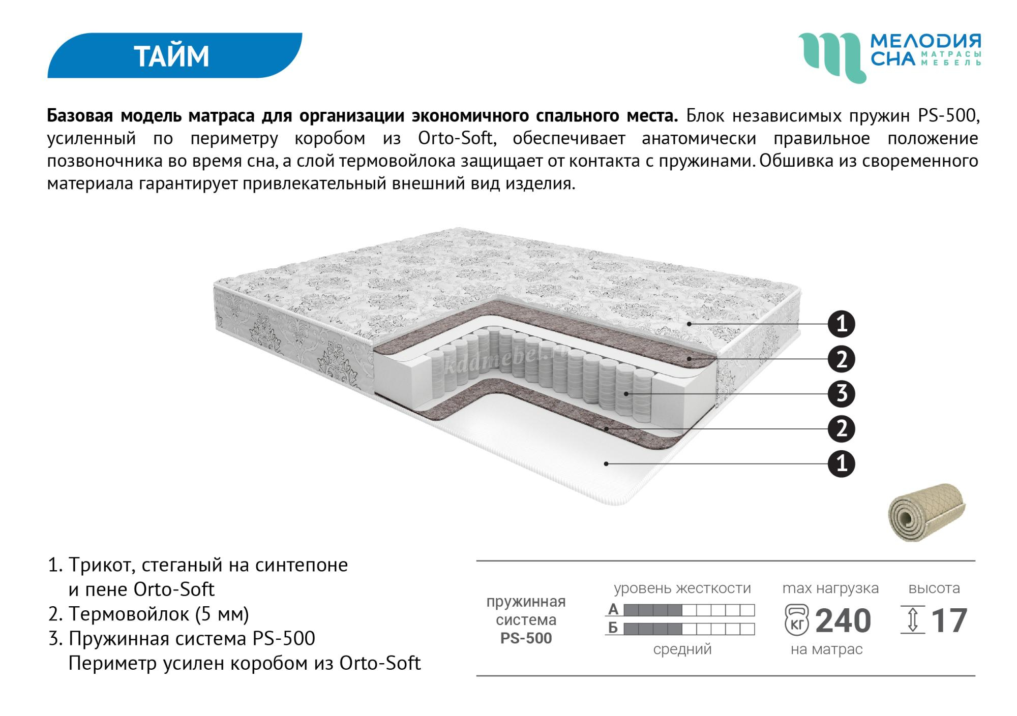 Базовая модель матраса для организации экономичного спального места. Блок независемых пружин PS-500, усиленный по перемитру коробом из Orto-Soft, обеспечивает анатомически правильное положениепозвоночника во время сна, а слой термовойлока защищает от контакта с пружинами. Обшивка из современного материала гарантирует привлекательный внешний вид изделия.
