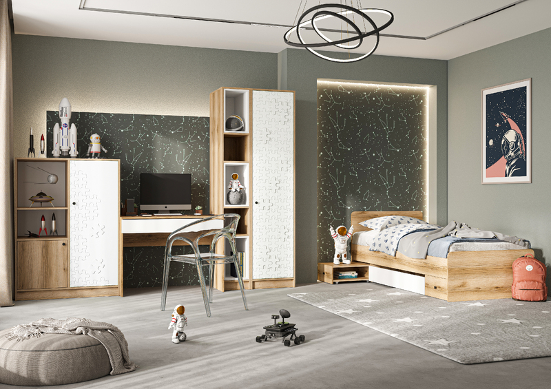 Модульная детская Киви состоит из нескольких модулей, которые обеспечат удобство и функциональность для детской комнаты. Этот комплект поможет создать уютное и функциональное пространство для ребенка, где он сможет играть, учиться и отдыхать с комфортом.
