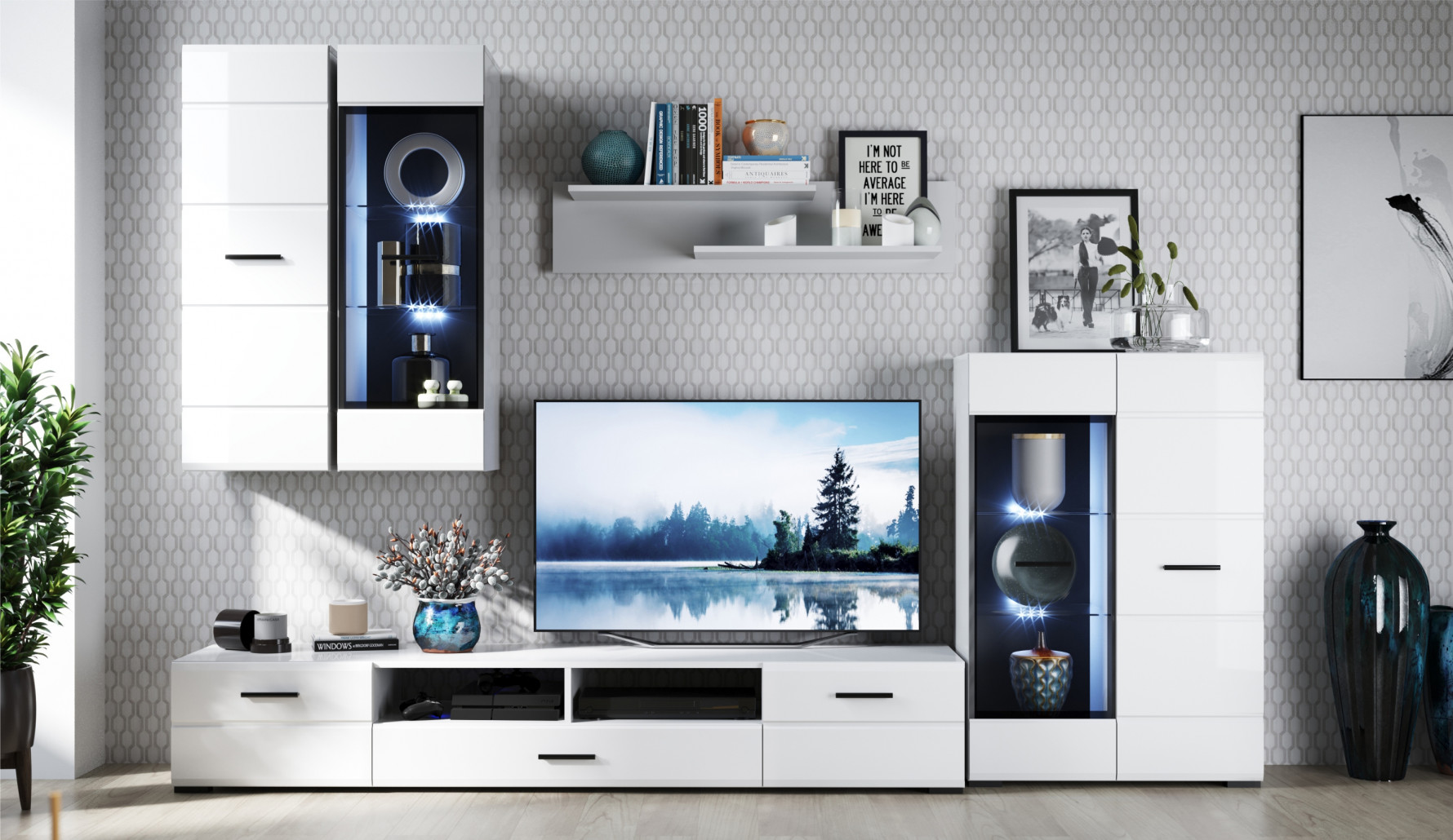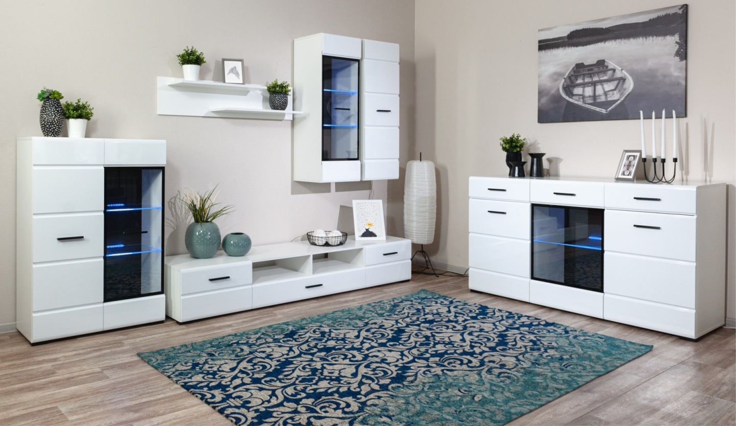 Модульная система Йорк выполнена в стиле минимализма. Строгие, лаконичные линии подчеркивают элегантность комплекта. Белый цвет мебели с деталями глубокого черного визуально сделает комнату светлее, просторнее и позволит составить безупречный по стилю комплект мебели. Сочетание глянцевой и стеклянной поверхностей, открытых полок создадут уютную обстановку и позволят украсить убранство комнаты приятными мелочами и разместить любимые книги и фото. Светодиодная подсветка придаст индивидуальность Вашей мебели. А широкая тумба для ТВ с выдвижными ящиками на телескопических направляющих позволит удобно разместить телевизор любой диагонали и другие медиаустройства Модульная система позволит подобрать по размеру вариант именно для Вашей комнаты, не оглядываясь на фиксированный размер, как в других стенках. Мебель выполнена из экологически безопасных материалов.