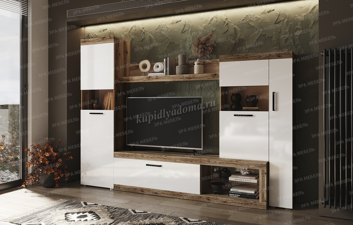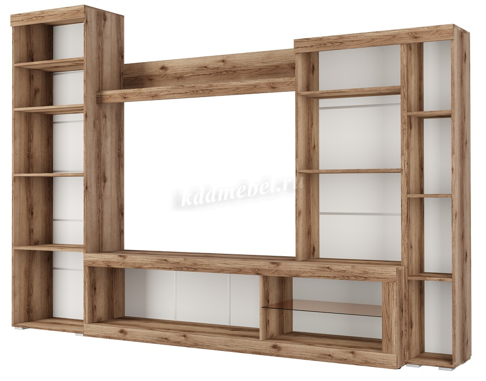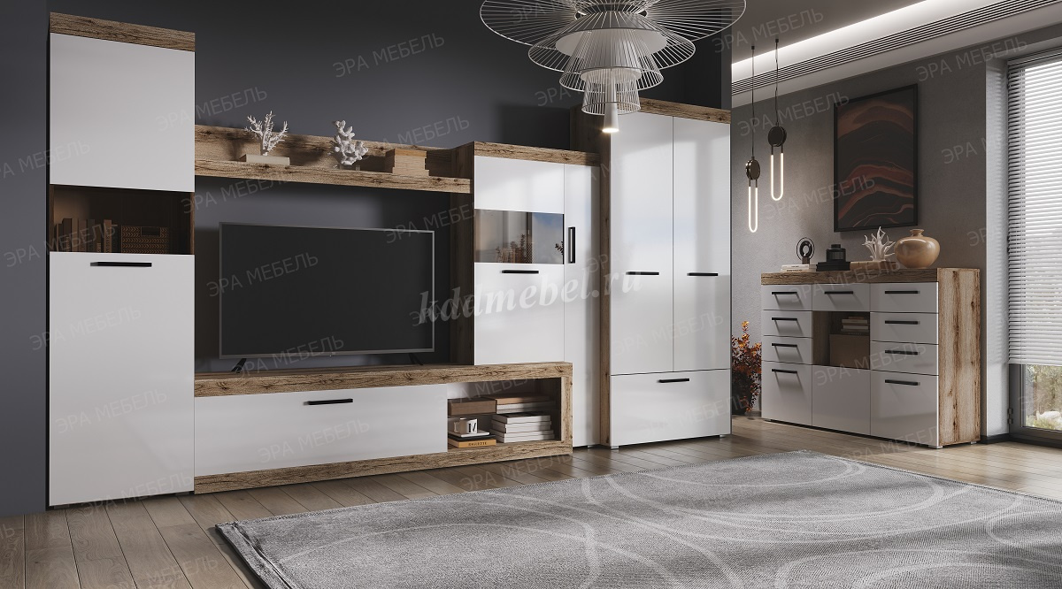 Состоит из шкафов с распашными дверями, тумбы для ТВ с выдвижным ящиком и открытыми нишами. В шкафах много вместительных полок.