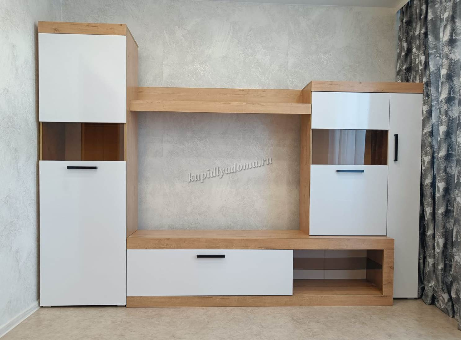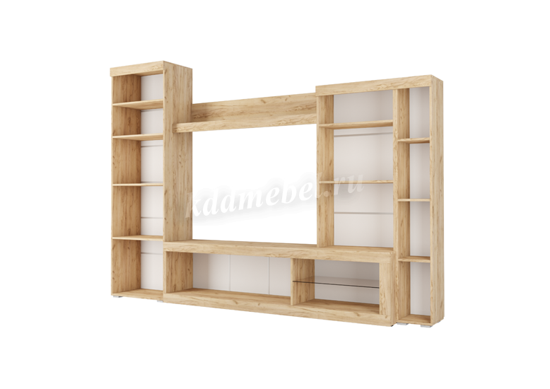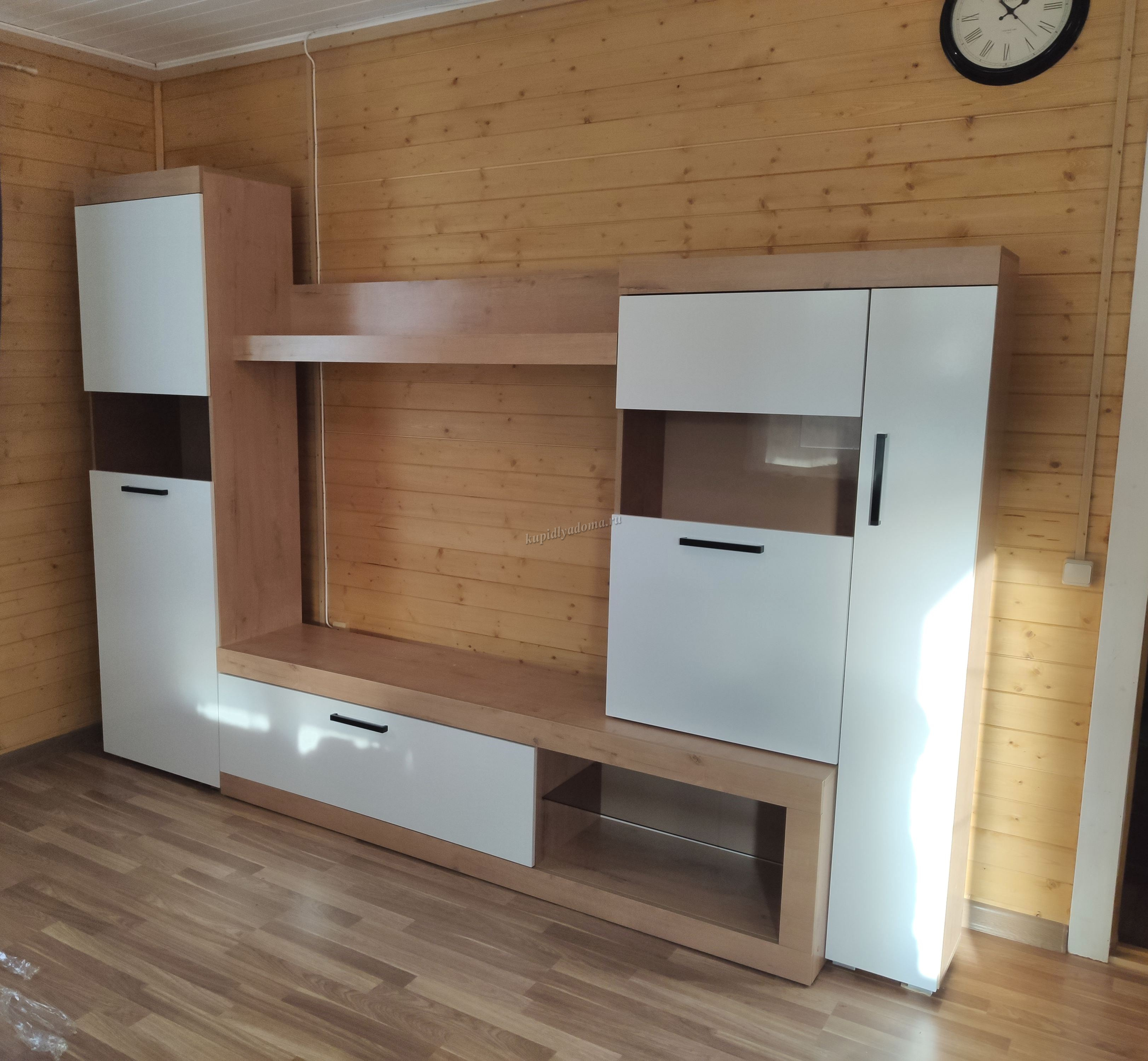 Состоит из шкафов с распашными дверями, тумбы для ТВ с выдвижным ящиком и открытыми нишами. В шкафах много вместительных полок.