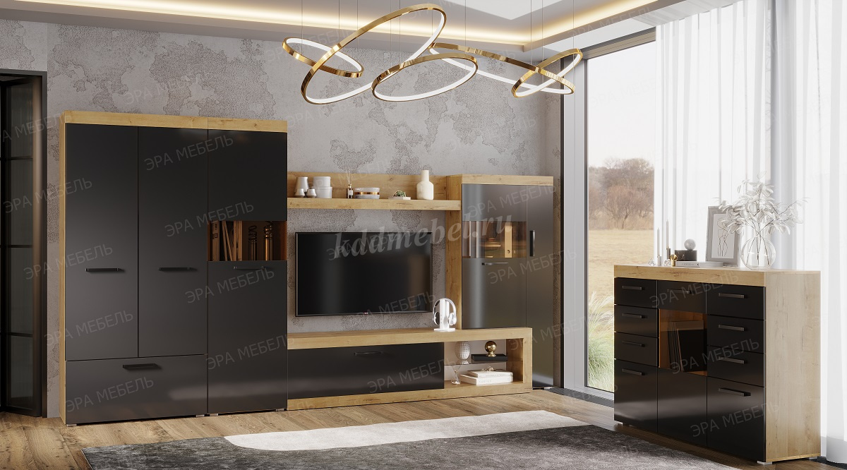 Описание Гостиная Бастон (Дуб вотан/Черный глянец)