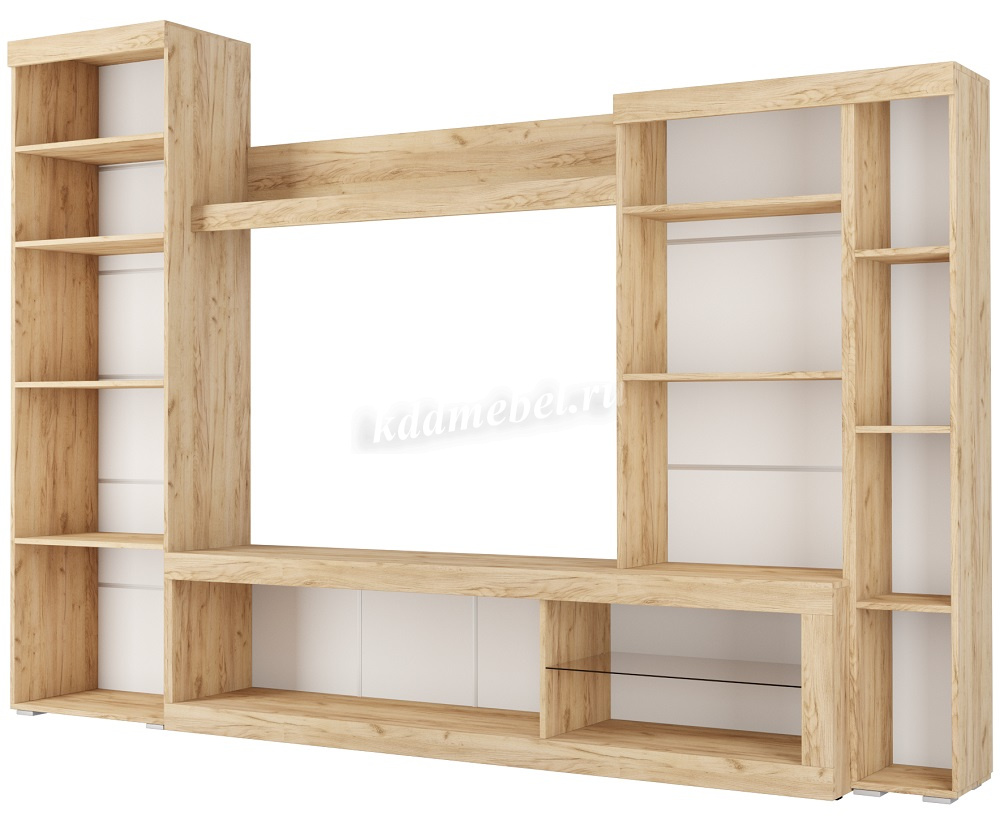 Состоит из шкафов с распашными дверями, тумбы для ТВ с выдвижным ящиком и открытыми нишами. В шкафах много вместительных полок.