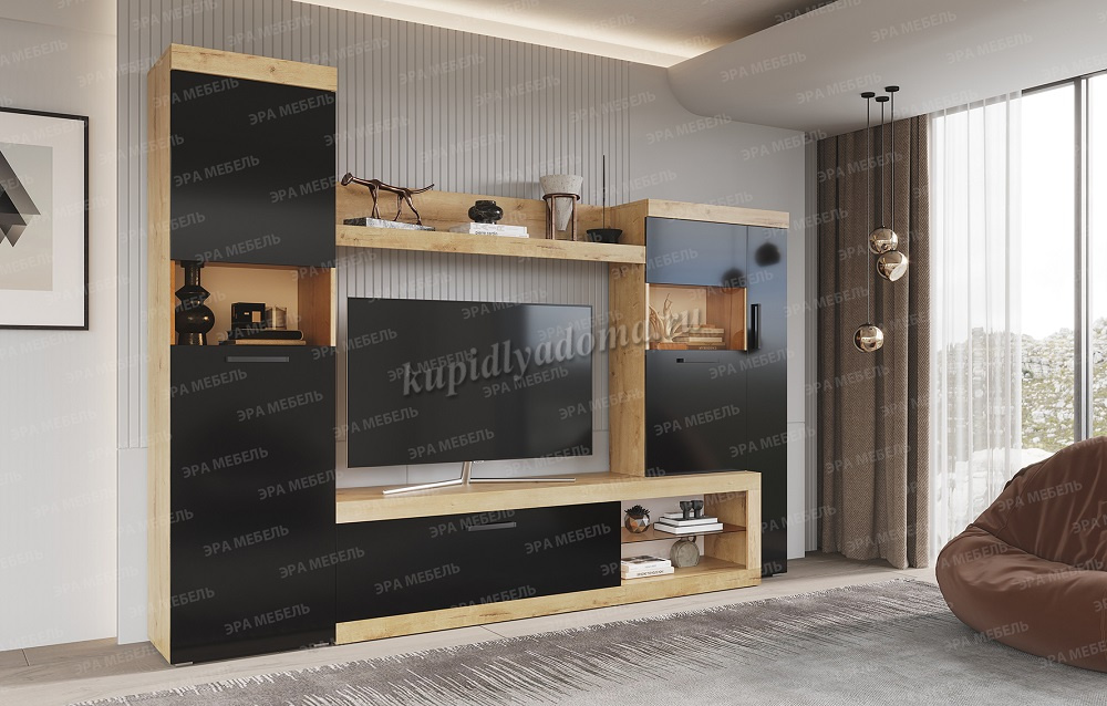 Гостиная Бастон (Дуб вотан/Черный глянец) наличие товара: