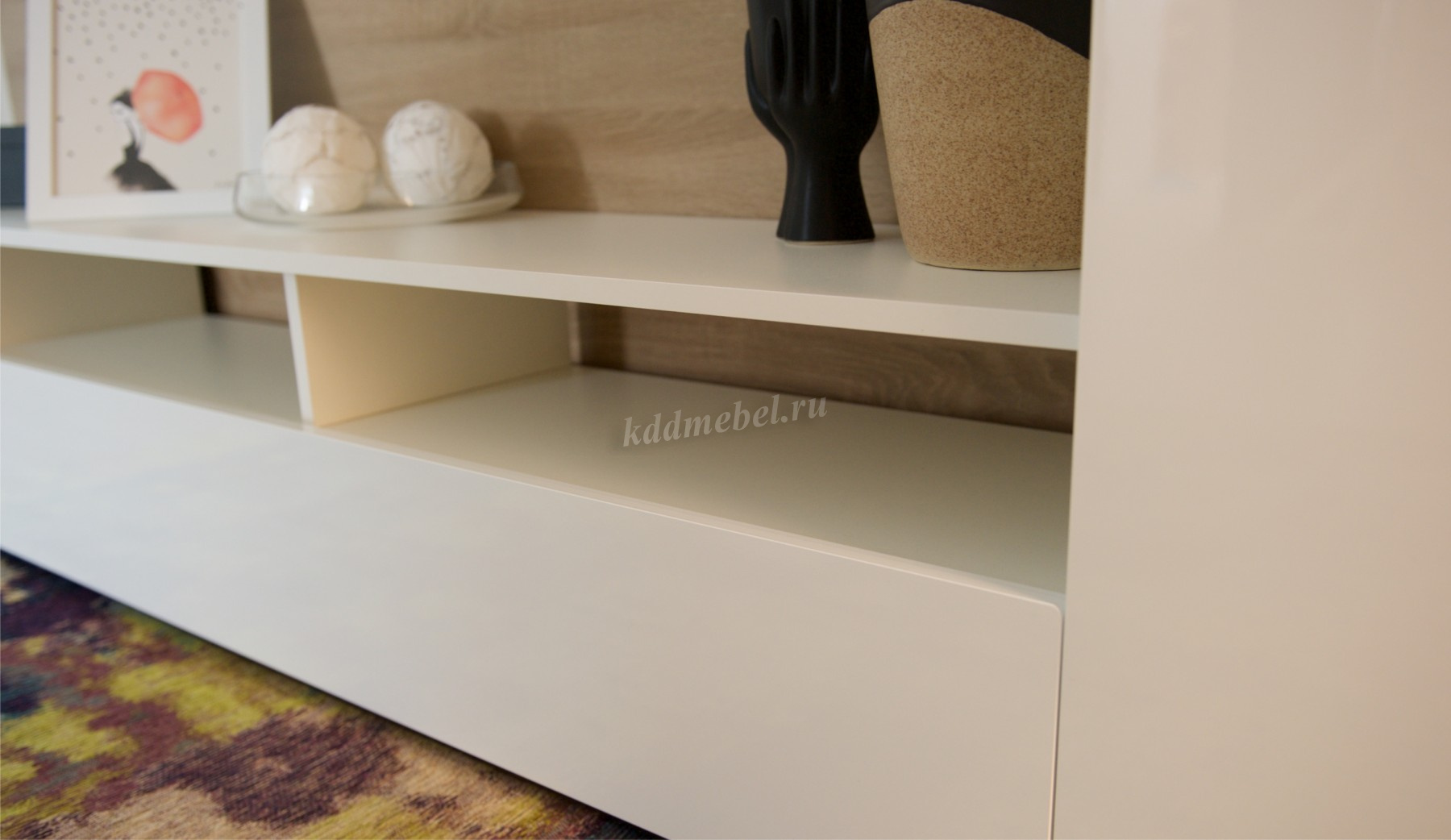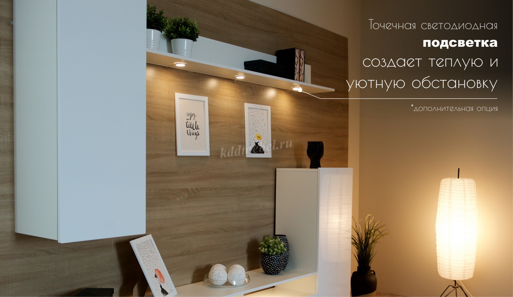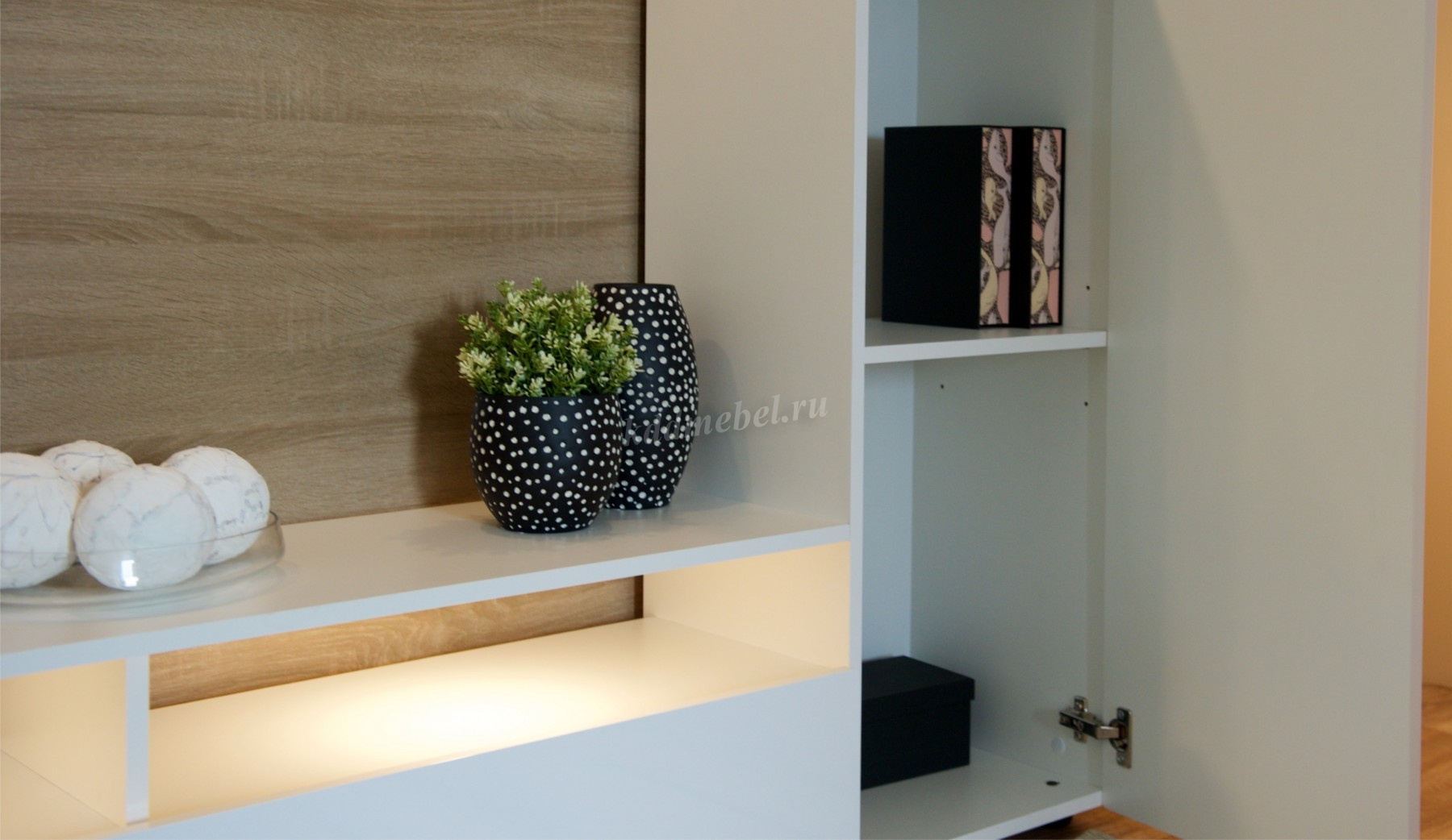 Гостиная Лия выполнена в современном европейском стиле. Её дизайн совмещает в себе современные тренды: белый глянец, скругленные фасады МДФ, отсутствие лицевой фурнитуры. Белый цвет отлично сочетается со всей цветовой палитрой, что позволяет создавать яркий интерьер и компоновать с другой мебелью. Стенка включает в себя нишу под ТВ с открытыми и закрытыми полками для размещения приставок, медиа устройств, книг и элементов декора. Дополнительно Вы можете доукомплектовать гостиную точечной подсветкой с проводкой, в комплекте 3шт.