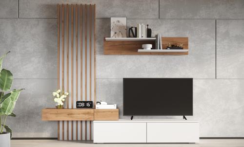 Интерьерная стенка Риана — это сочетание современного дизайна и природной теплоты для создания организованного пространства. Фактура натурального дерева, используемая в отделке, создает уютную атмосферу, которая наполняет дом комфортом и природной гармонией. Декоративная стеновая панель с вертикальными рейками МДФ – яркий акцентный элемент, добавляет структурированности и выразительности . Благодаря нейтральным цветам декора, стенка подойдет практически к любому интерьеру.