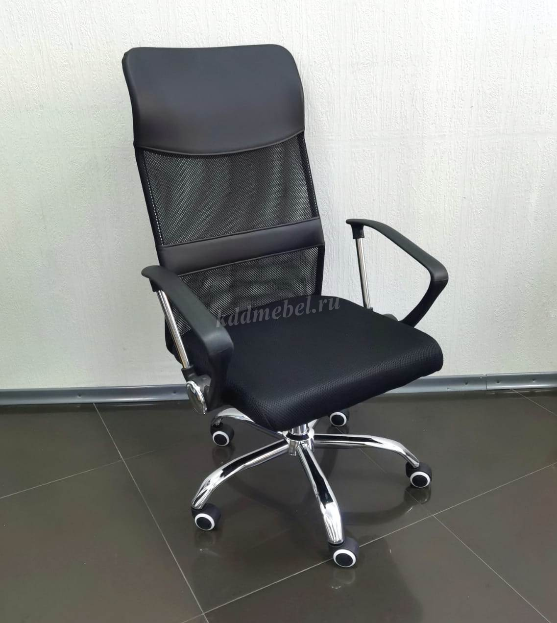 Современное офисное кресло с высокой спинкой, сиденьем из сетки и устойчивым пятилучным хромированным основанием,