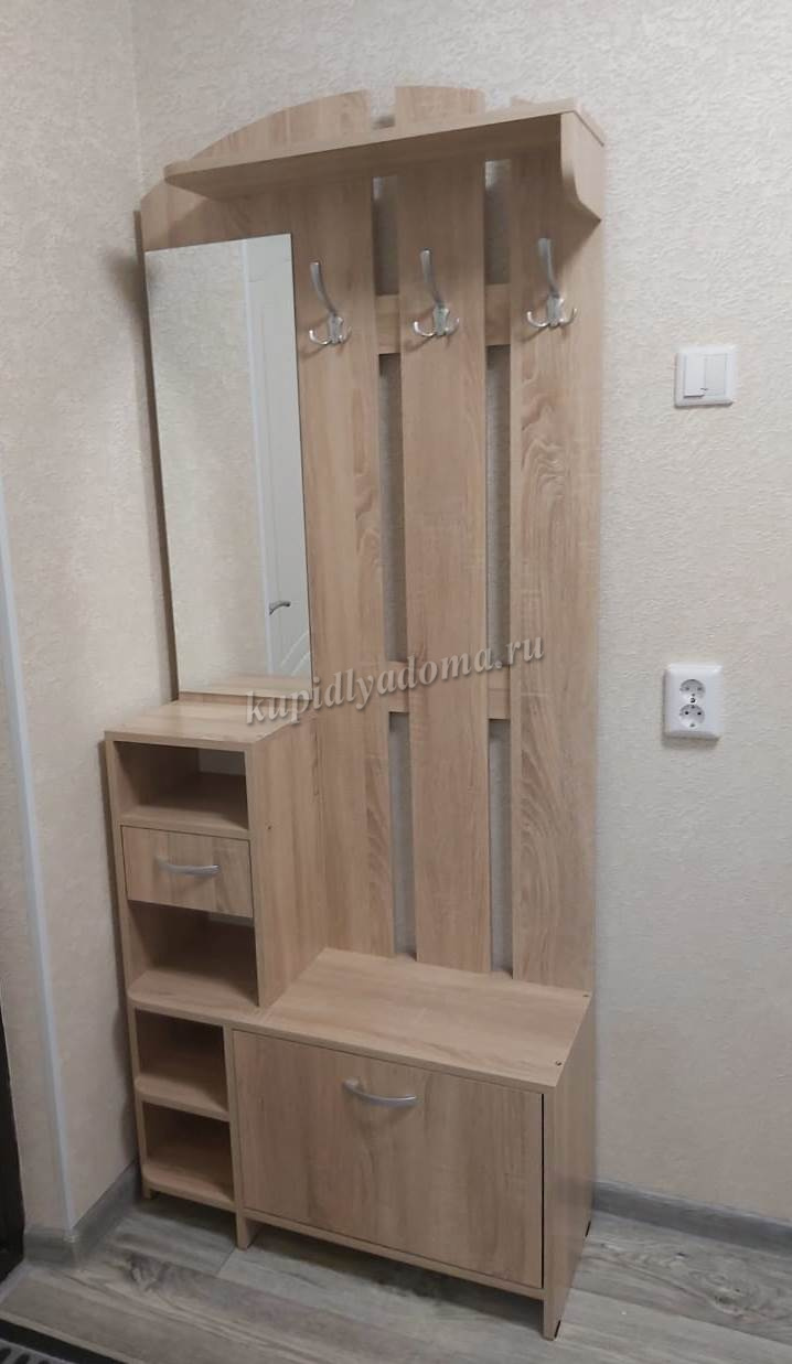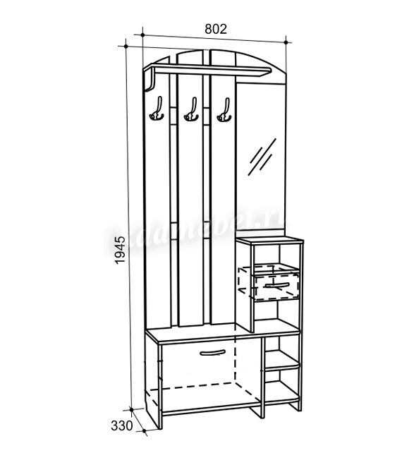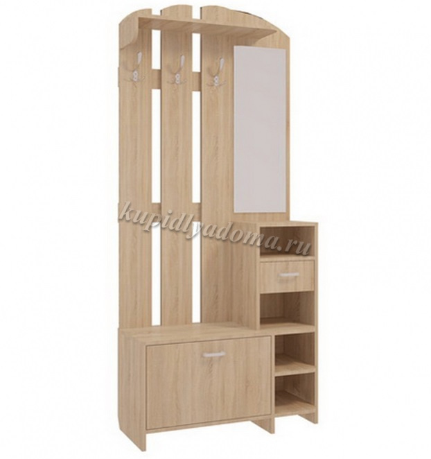 Состоит из: полок, вешалки с крючками для одежды и сумок, обувницы, открытых полок, зеркала, полки для головных уборов, выдвижного ящика.