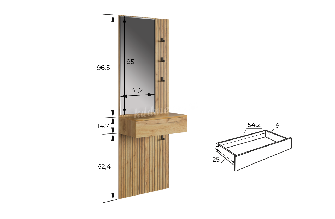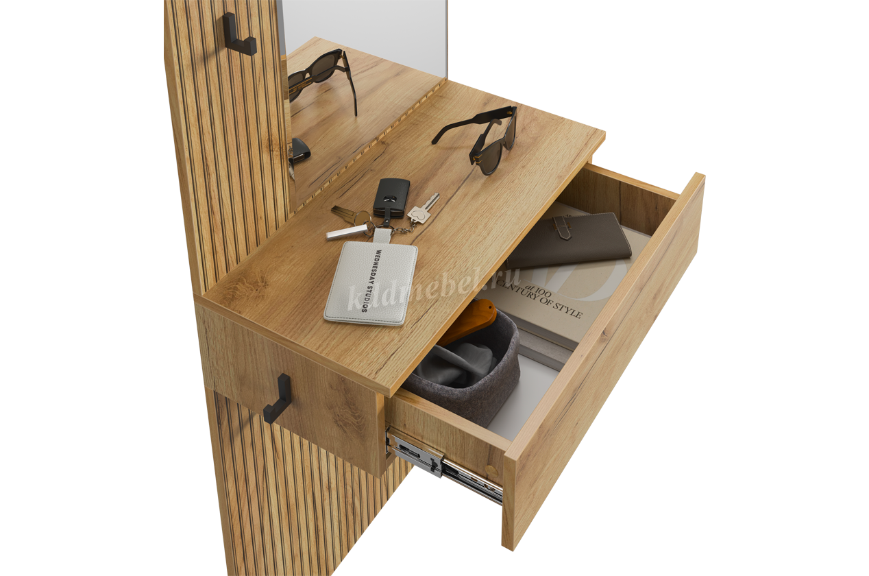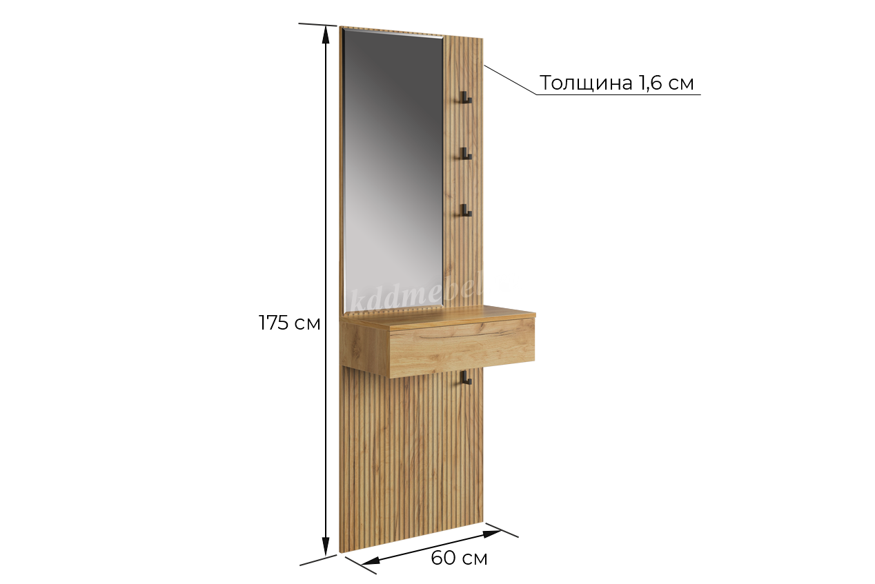 Принт, имитирующий вертикальную фрезеровку, придает зеркалу уникальный и современный вид, добавляя текстуру и глубину. Крючки предоставляют удобное место для хранения сумок или аксессуаров. Выкатной ящик служит дополнительным пространством для хранения мелочей, таких как ключи, кошелек, косметика или другие небольшие предметы.