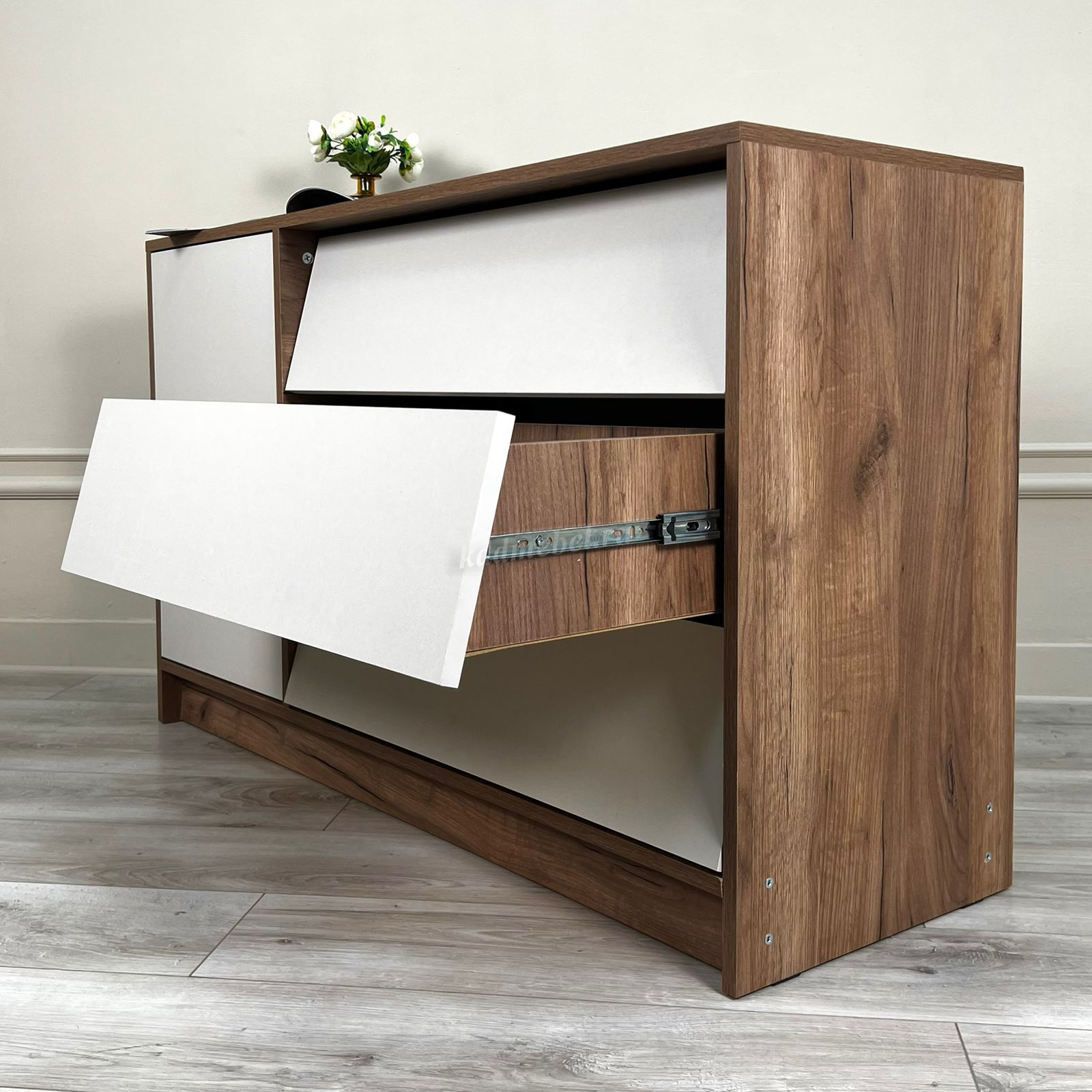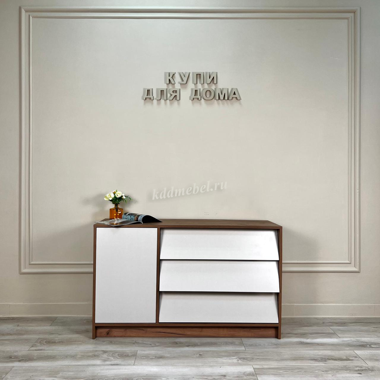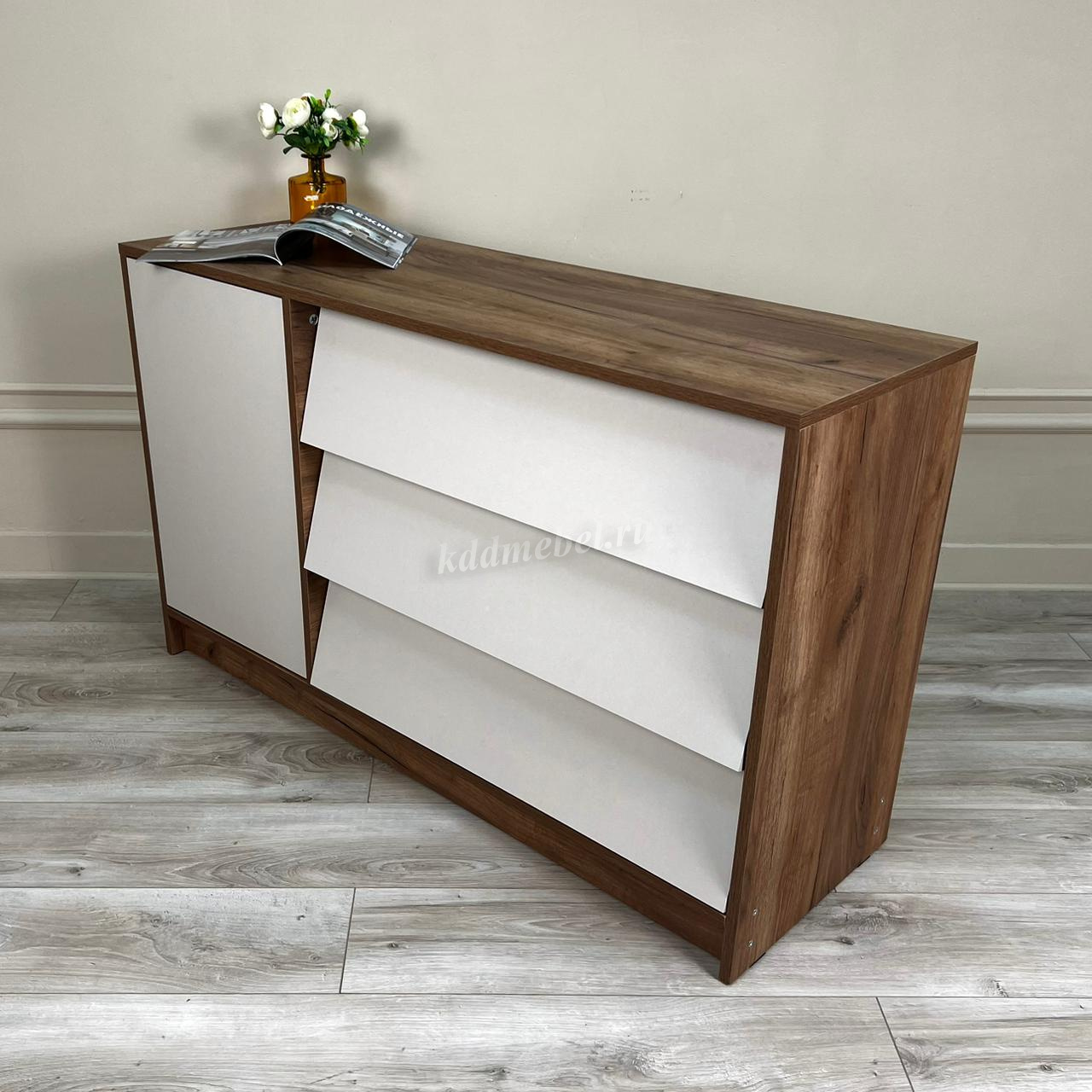 Современный универсальный комод «Рейн» - это практичное решение для хранения вещей в спальне, гостиной или прихожей. Дизайн модели выдержан в узнаваемом стиле коллекции. Комод оснащён: тремя вместительными выдвижными ящиками - идеально подойдут для белья, одежды, аксессуаров; закрытым отделением с полкой удобно для хранения более объемных вещей.