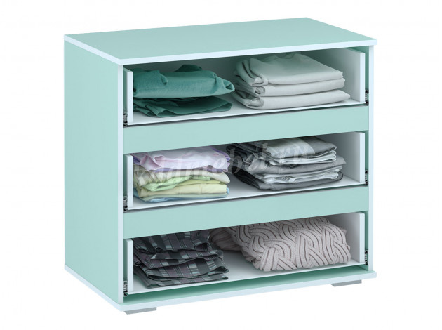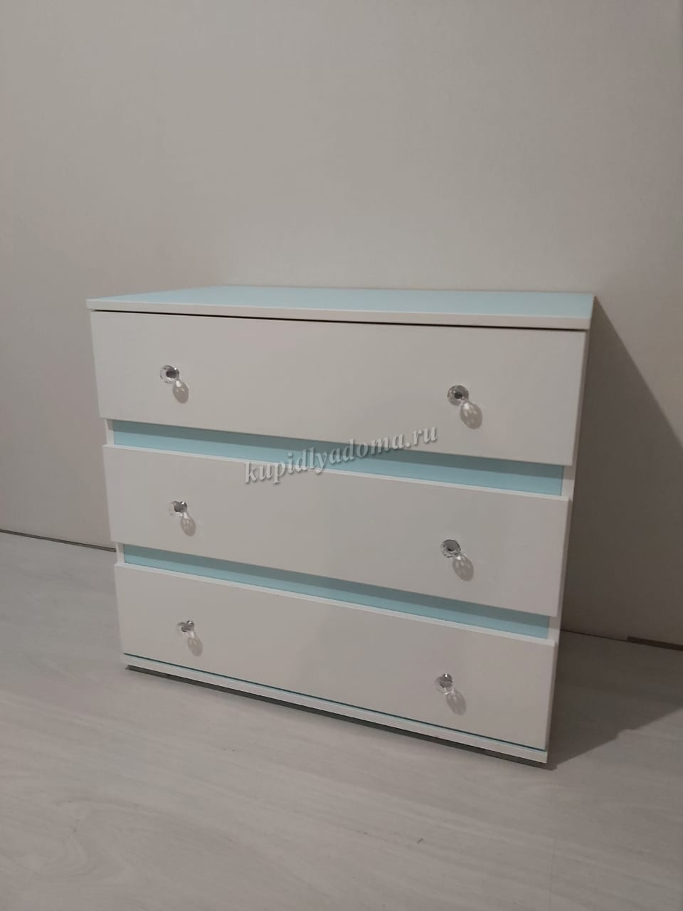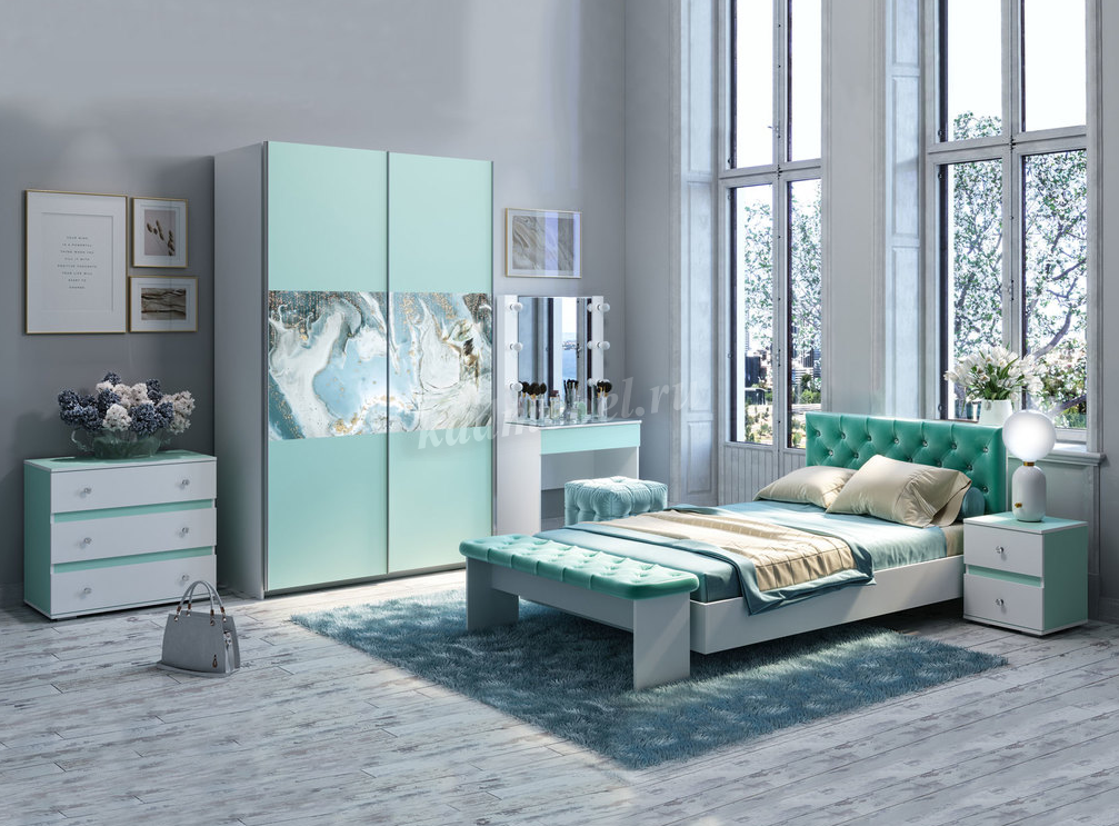 Нежно-бирюзовые тона корпусов коллекции, в обрамлении снежно-белой кромки идеально гармонируют с белыми фасадами, украшенными ювелирными ручками. Полноразмерная "парящая" кровать с нижней подсветкой декорирована мягким изголовьем из благородного бархата цвета Тифани с сияющими стразами. Туалетный столик оснащен подсветкой, розеткой и выключателем . Неоспоримой изюминкой туалетного столика является съемное стеклянное покрытие столешницы с фацетной кромкой. Тифани - изящество и утонченность истинных леди!