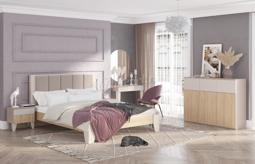 Эксклюзивная коллекция для спальни «Беатрис» выполнена в цвете Палермо с тиснением натурального матового дерева и украшена вставками из МДФ в цвете Латте с матовой приятной текстурой. Теплые расцветки золотисто-коричневого цвета создают уютную атмосферу. Комплект мебели для спальни оформлен по всем правилам современного стиля, и не пестрит деталями, ведь главное в спальне – лаконичность, законченность и продуманность. Модульная серия «Беатрис» имеет множество преимуществ: