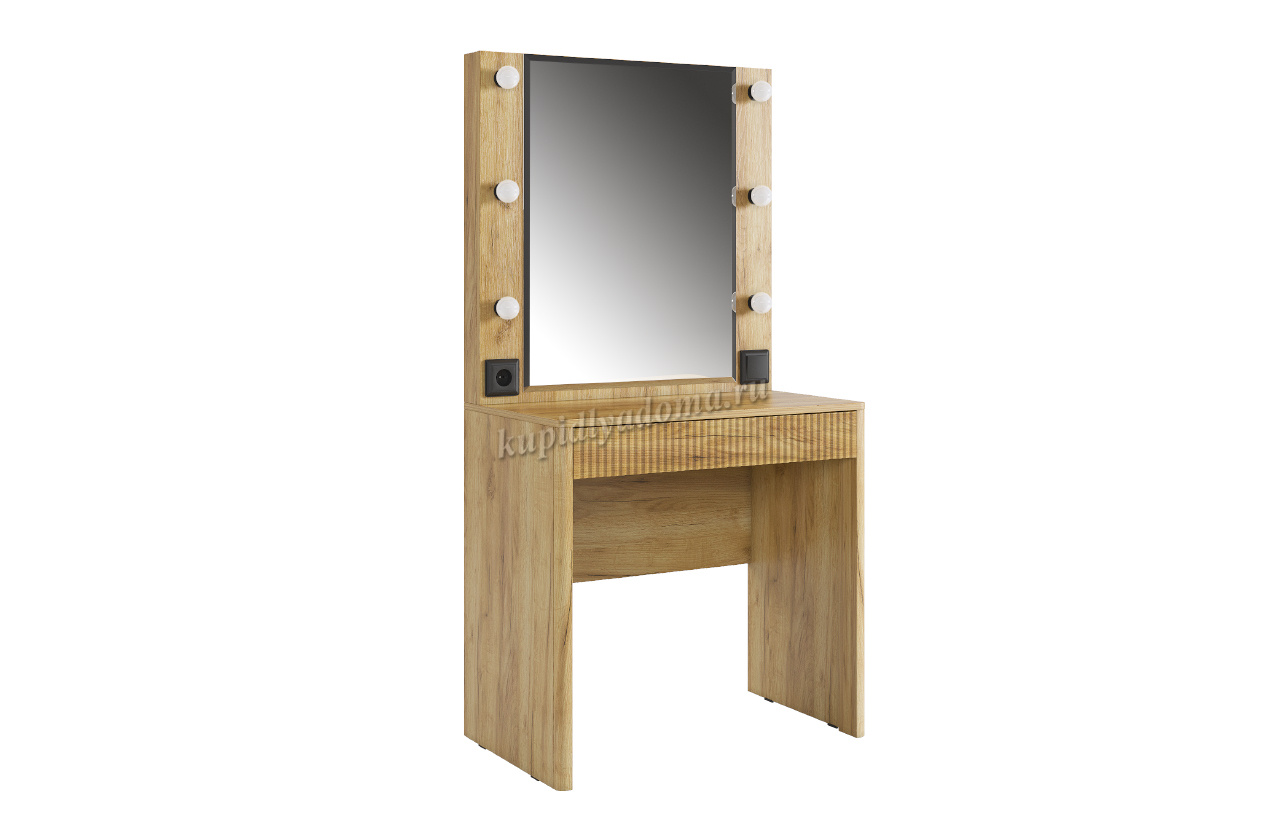 Трюмо Адам — это идеальное сочетание стиля и практичности. С широким фацетированным зеркалом, в котором встроена подсветка из 6 лампочек, оно создает атмосферу профессиональных студий визажистов прямо у вас дома. Комфорт и функциональность обеспечиваются дополнительными элементами, такими как выключатель, розетка для фена и выдвижной ящик для хранения украшений и косметики. Элегантные закругленные углы завершают дизайн, делая его идеальным дополнением к вашей спальне.