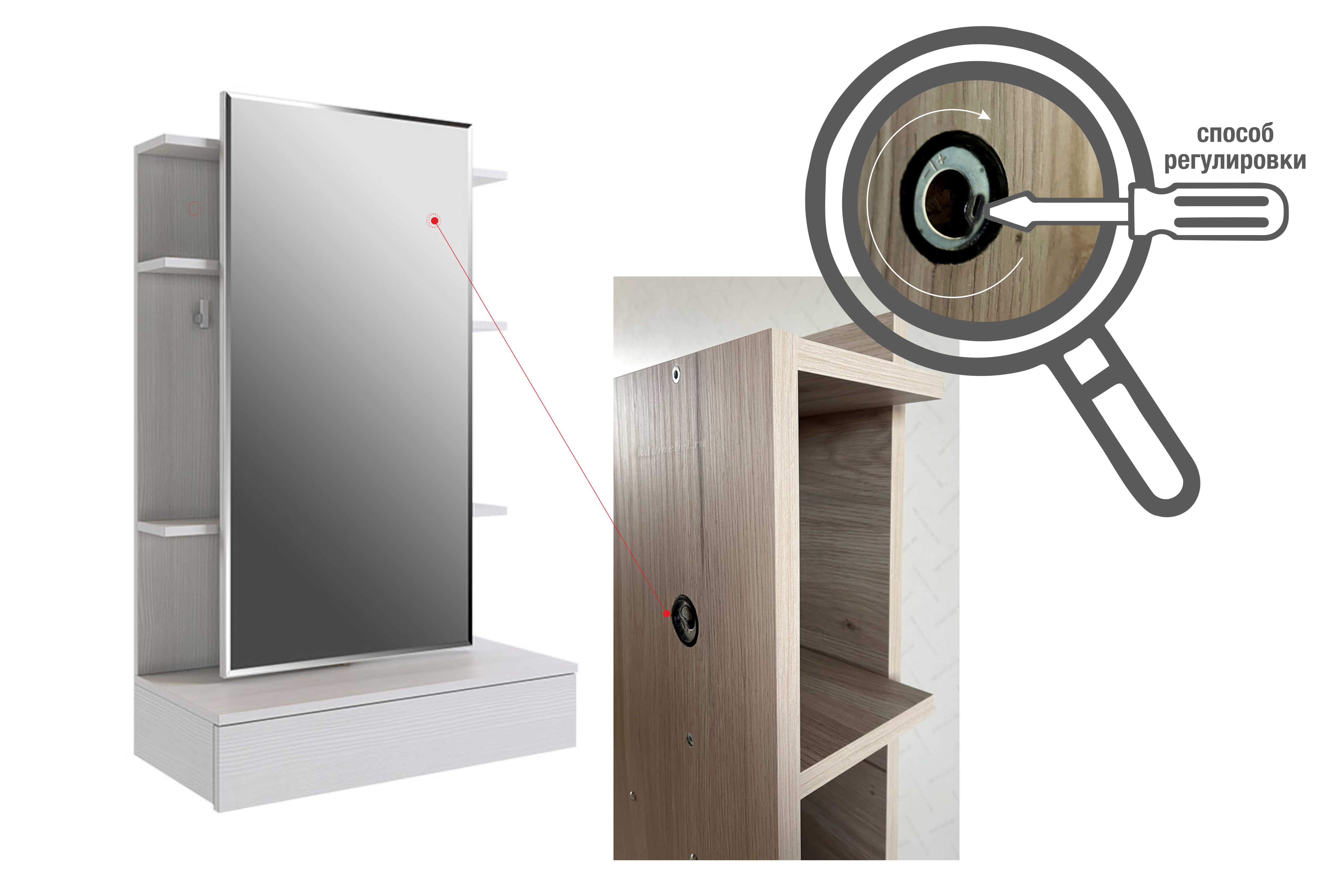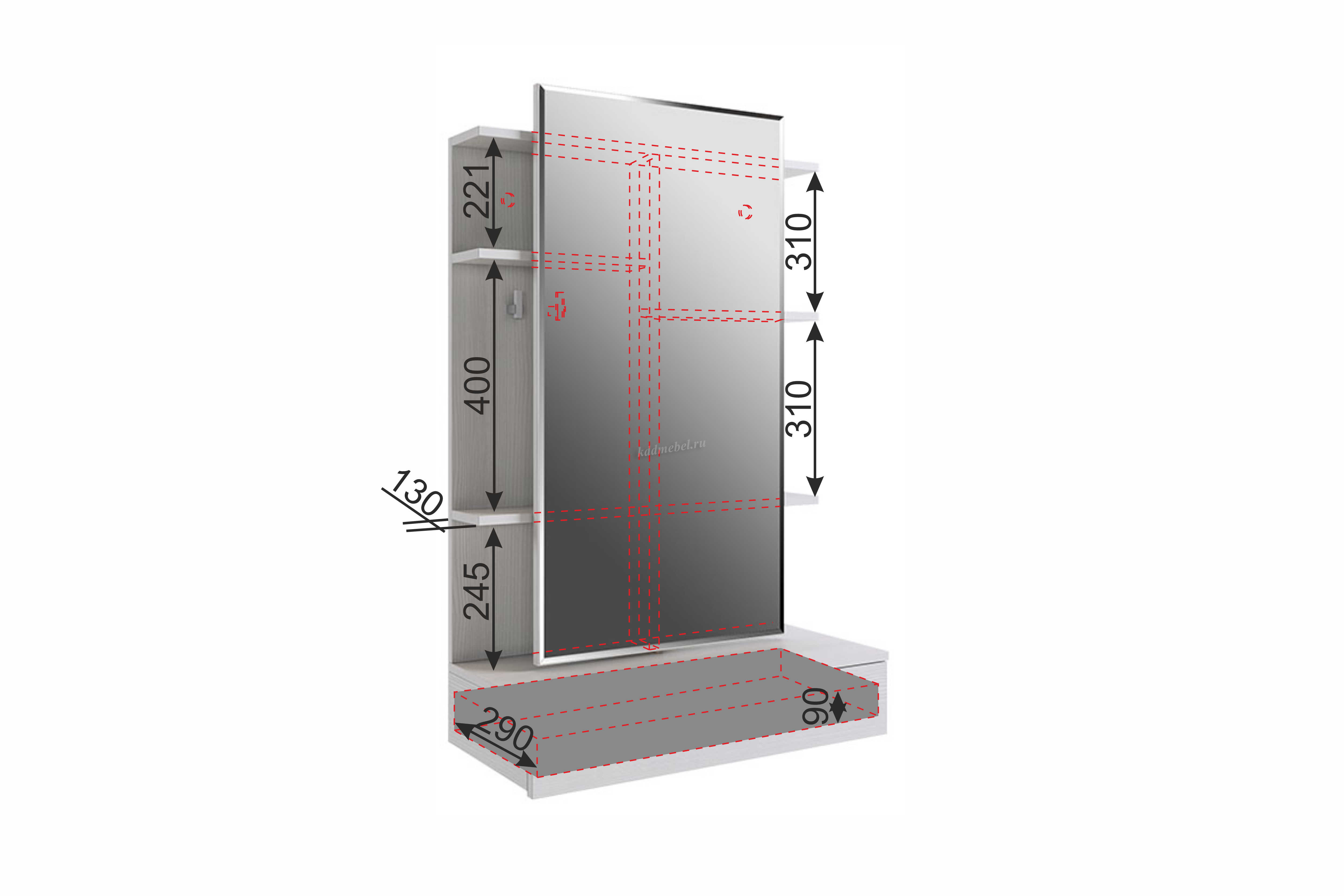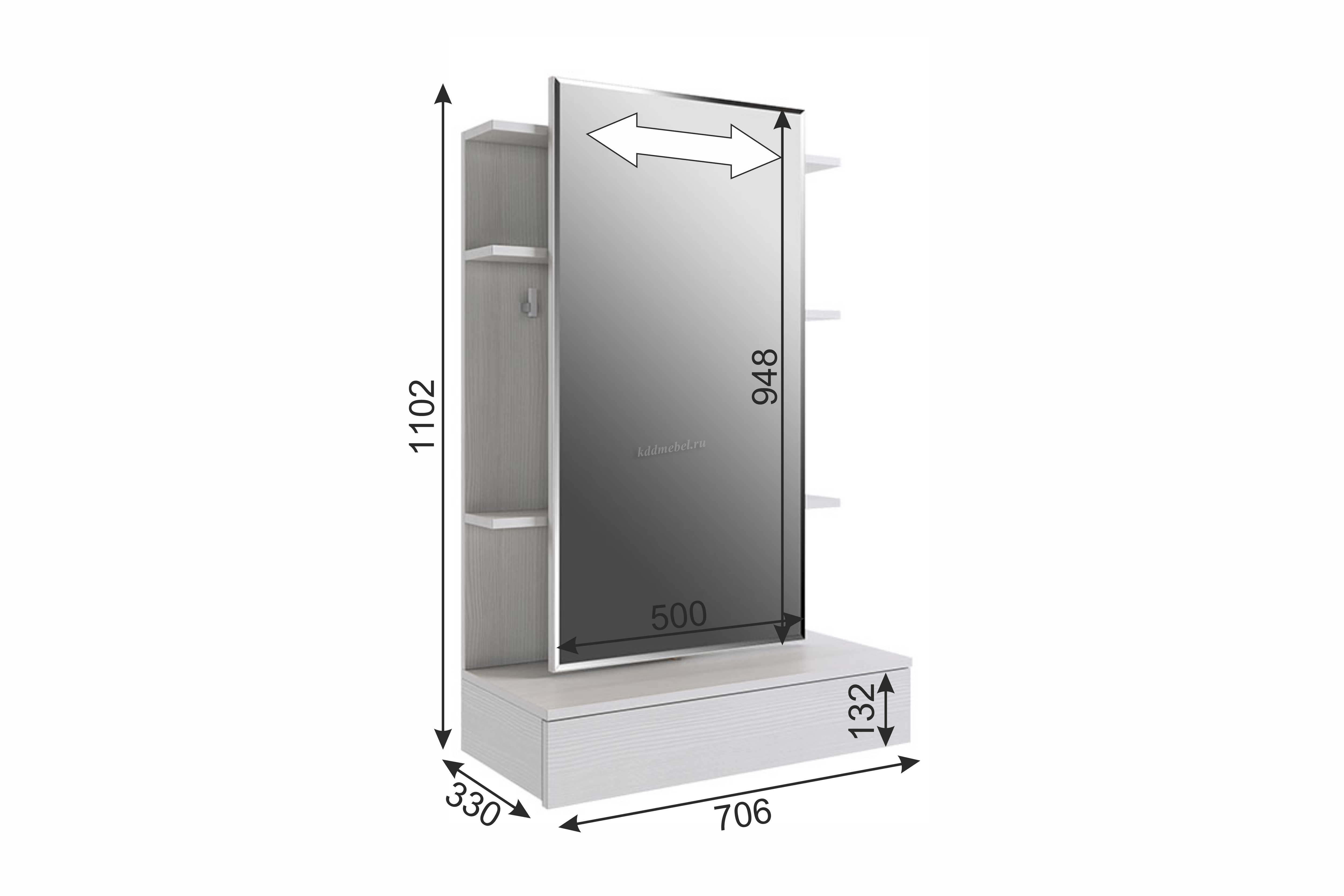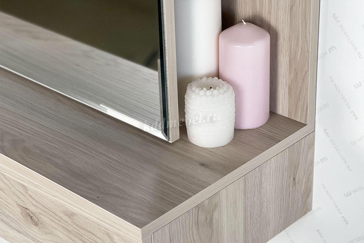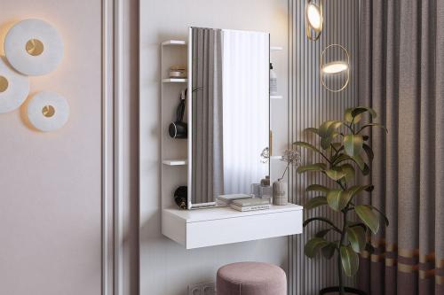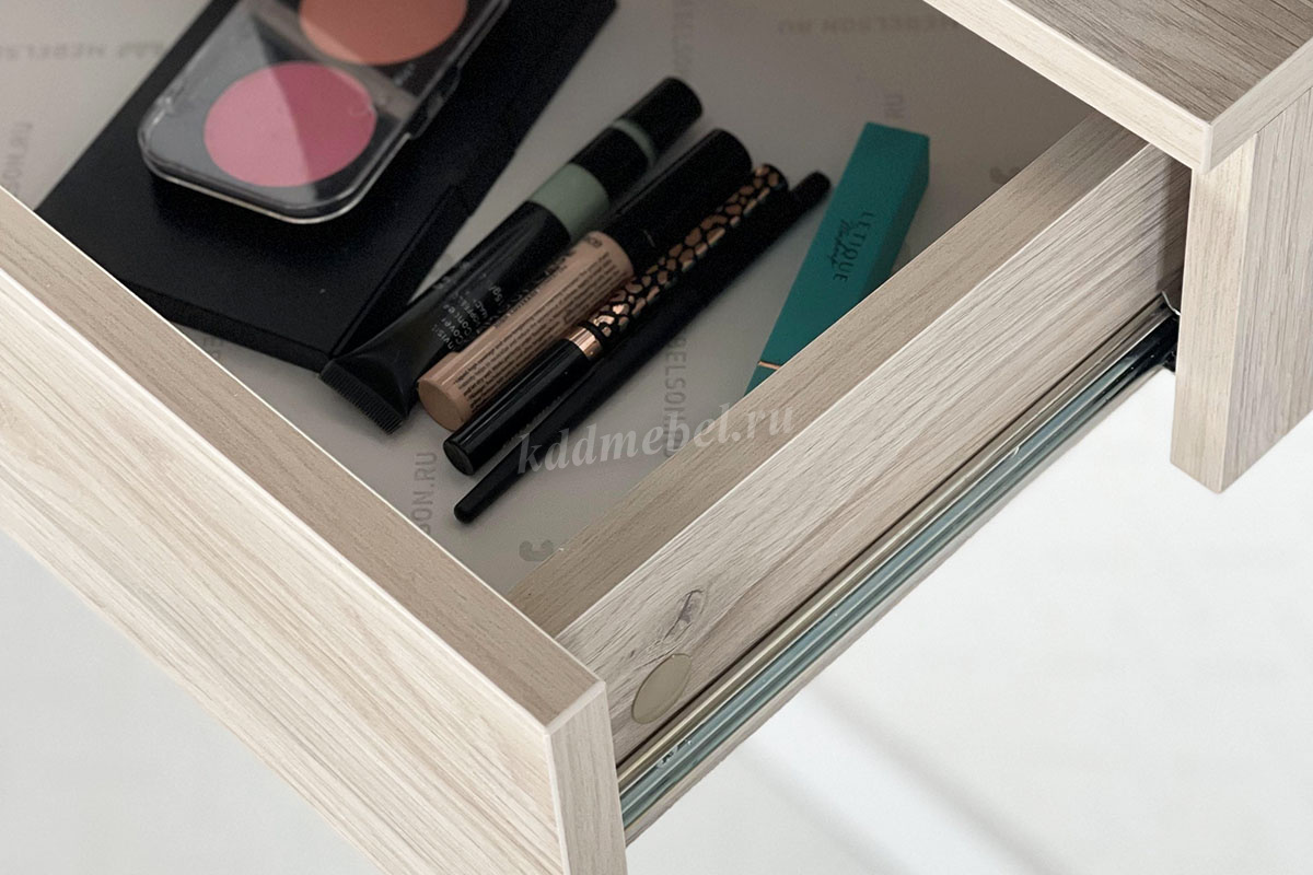 Зеркальная панель трюмо работает по принципу шкафа-купе, что обеспечит вам легкий доступ к вещам, которые лежат на полках за зеркалом.