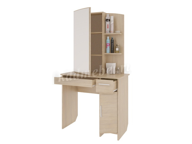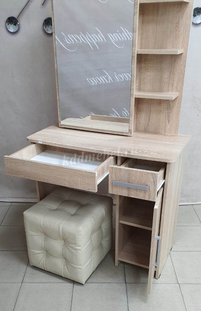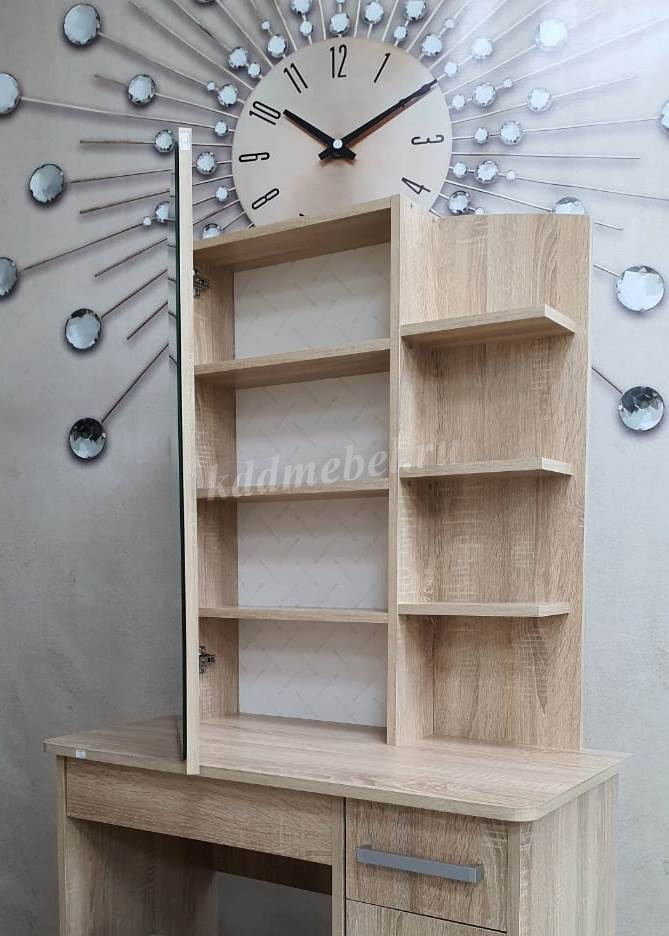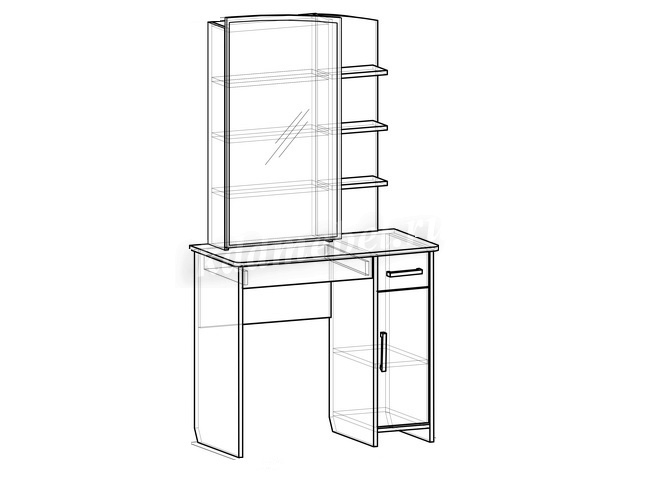 Состоит из: зеркала, полками открытыми и закрытыми, а также ящиками выкатными для мелочей