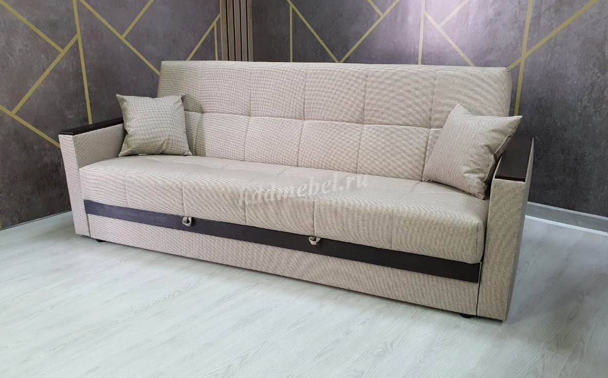 При трансформации требуется расстояние между диваном и стеной. Мебель является пристенной. Механизм «Книжка» прост и надежен в эксплуатации. Напольное покрытие в процессе раскладки не задействовано, Вы можете использовать пушистые ковры или дорогие паркеты. Емкость для хранения постельных принадлежностей с ламинированным основанием обеспечит Вам дополнительное пространство для хранения и сэкономит Ваше время при подготовке дивана ко сну. Ламинированное основание обеспечит простоту и удобство при уборке. Декоративные накладки из МДФ на подлокотниках и передней части короба, сочетают в себе представительность и элегантность, придают изящность дизайну