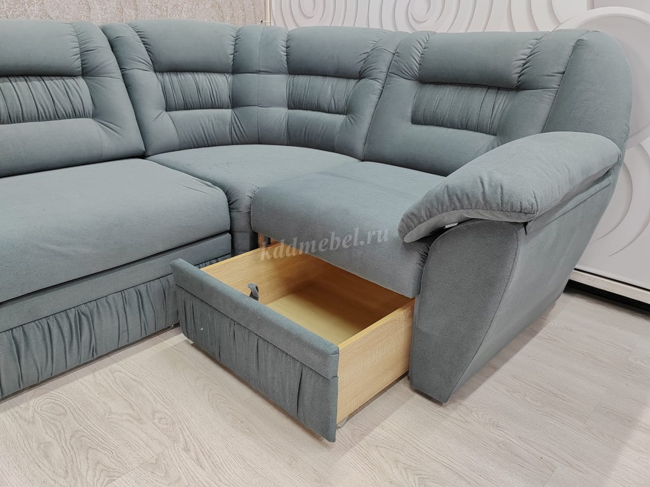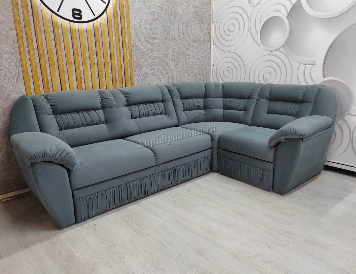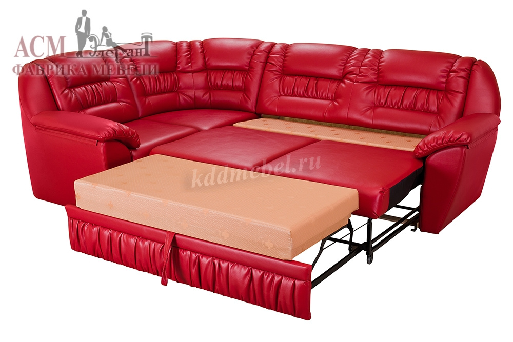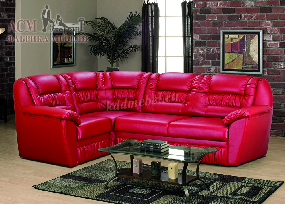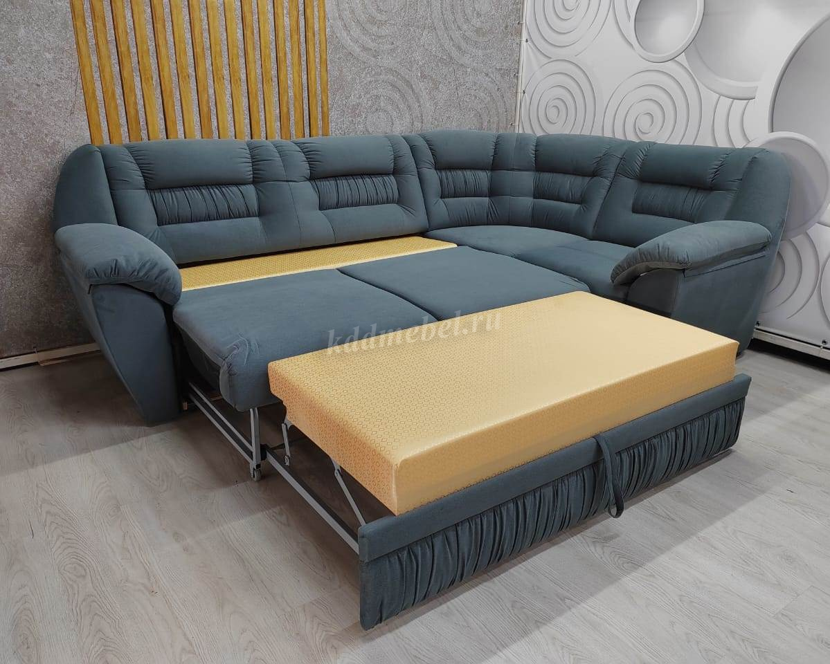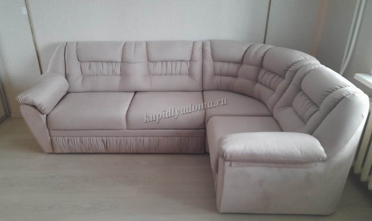 Угловой диван габаритного типа. Направление угла универсальное, сборка производится без инструмента. Приставное кресло с емкостью и подъемным механизмом - 1 шт. Съемная подушка на подлокотнике – 2шт. Наполнение: спинка из упругого эластичного ППУ 22; спальное место состоит из трех элементов сиденья дивана, подголовника и рамы механизма «акнар». Обвивка ткани: в одной или двух тканях (1 – сиденье, спинка; 2 - нижняя часть каркаса). Возможно полностью в кожзаме. Жесткость спального места среднее. Состав: слой ППУ 28 плотности на упругом основании посадочного места типа «змейка», исключение рама «акнар». Емкость для вещей из ДСтП и ДВП.