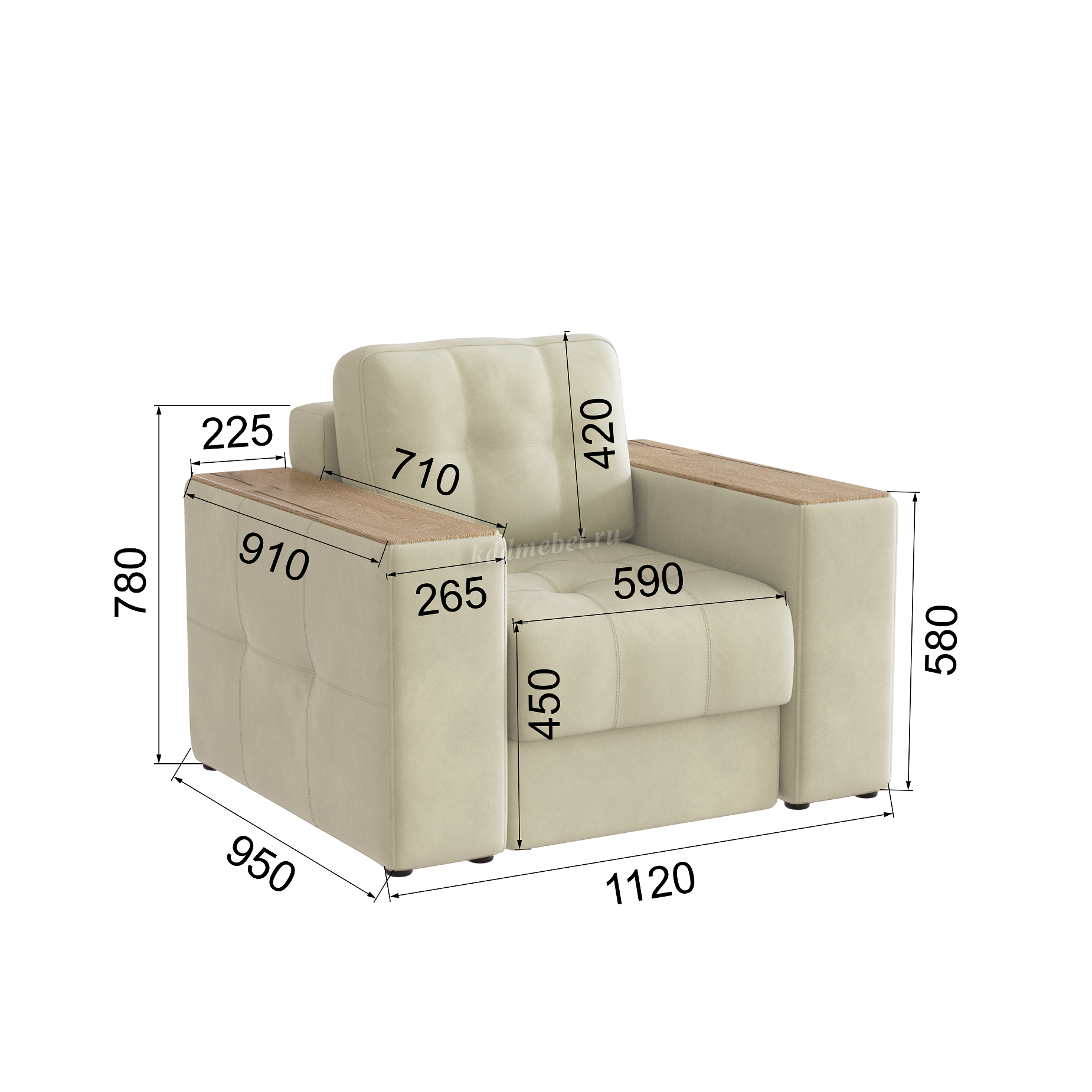 Подлокотники шириной 265 мм, обтянутые тканью и простеганные двойной отделочной декоративной строчкой.