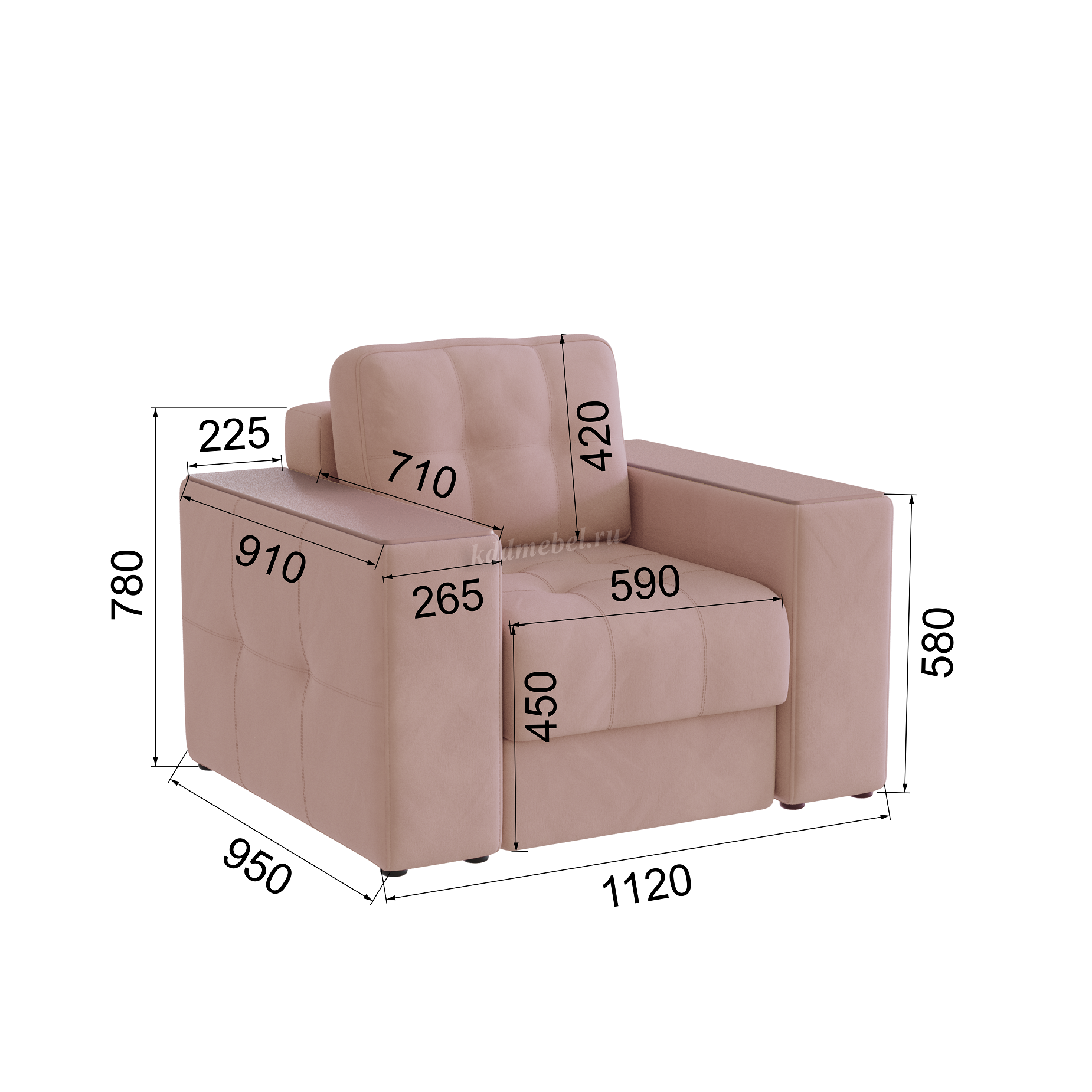 Подлокотники шириной 265 мм, обтянутые тканью и простеганные двойной отделочной декоративной строчкой.