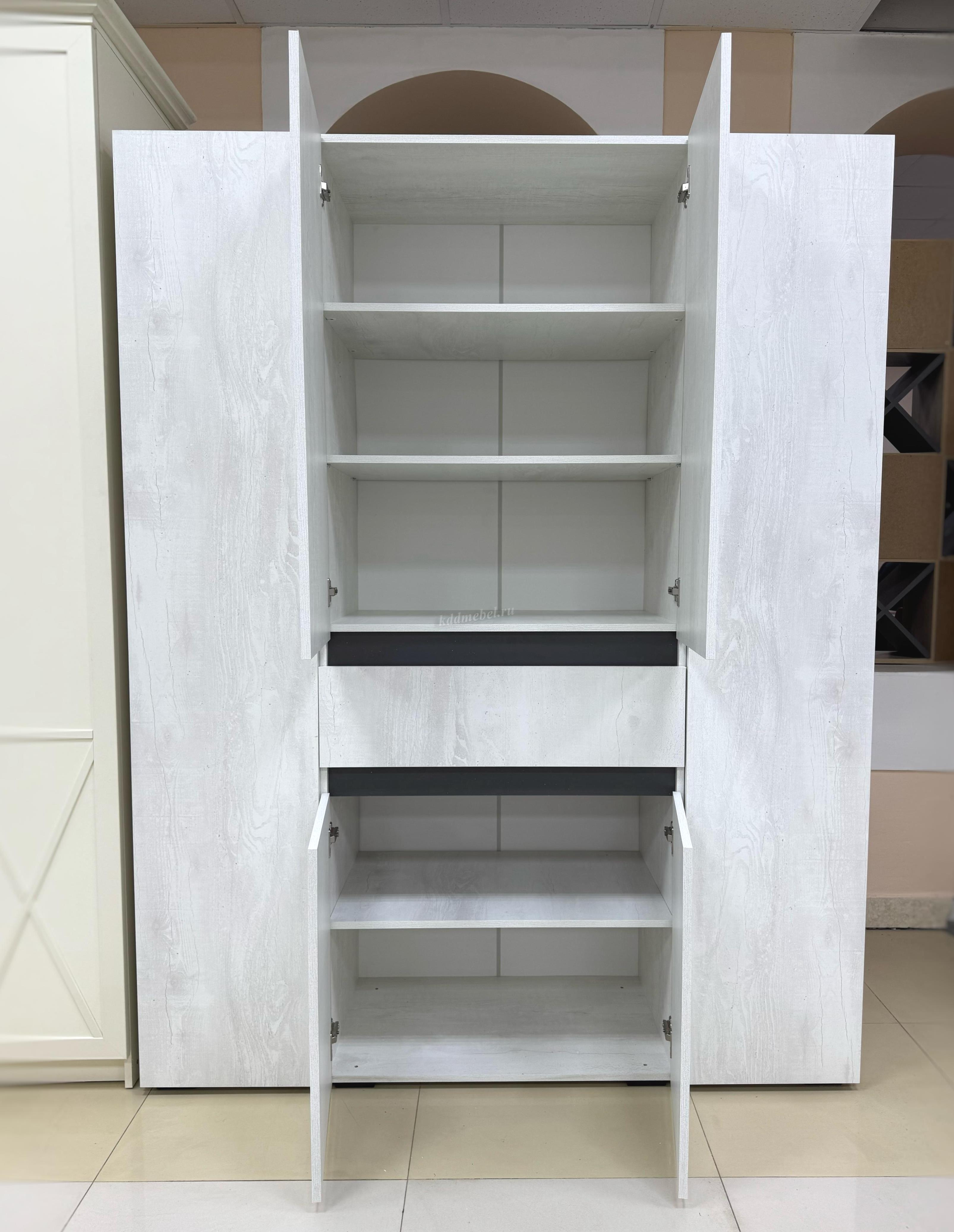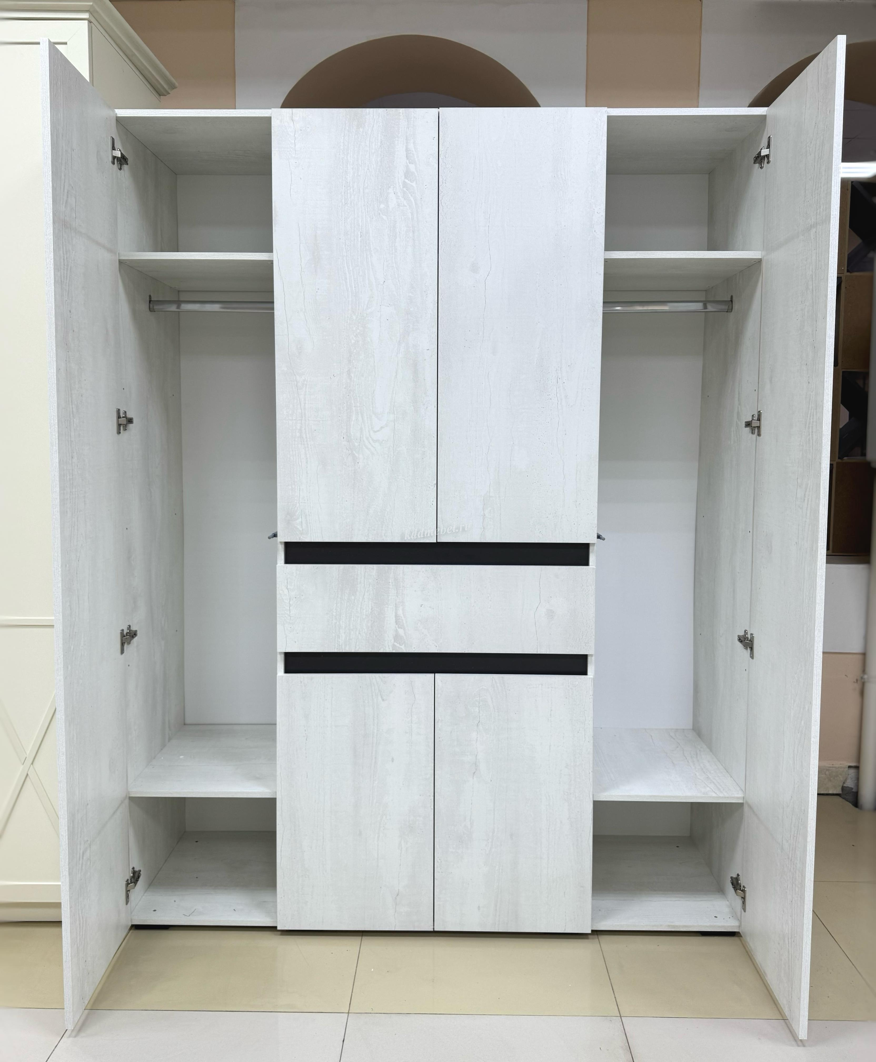Четырехстворчатый шкаф «Мрия» – это настоящая находка для семьи, а также для обладателей большой коллекции одежды. Два крайних отсека идеально подойдут для хранения верхней одежды, костюмов и рубашек. Центральная секция с полками и ящиком - для постельного и нижнего белья, также здесь можно хранить обувь.