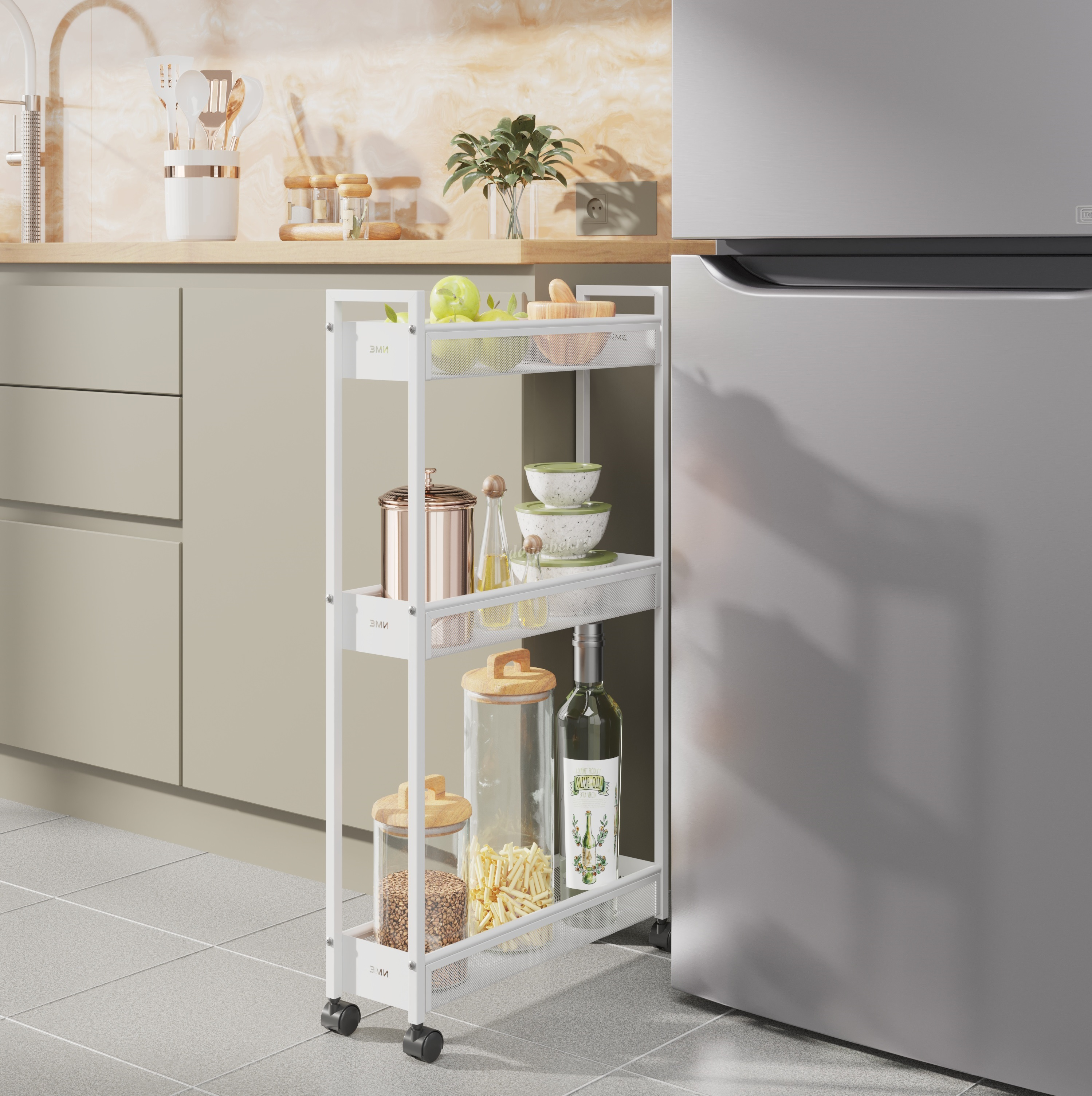 Эта лёгкая, но прочная этажерка с вместительными корзинами и мобильными колесиками (360°) легко перемещается и вписывается в любой интерьер.